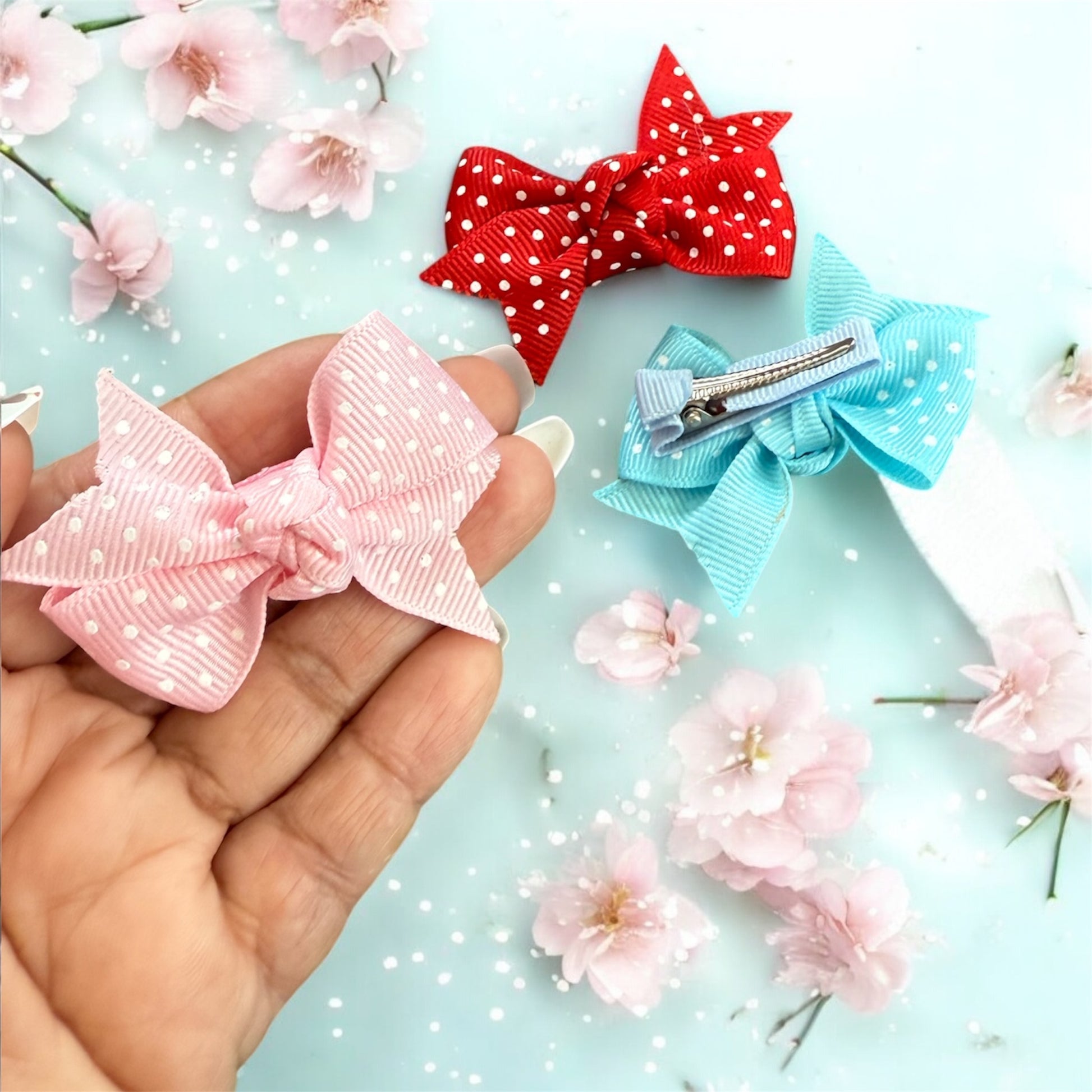 These soft baby bows are made with high-quality materials. Perfect for adding a charming touch to your baby's outfit. Available in three different colors with white polka dots. Expertly handmade for your little one's special occasions.