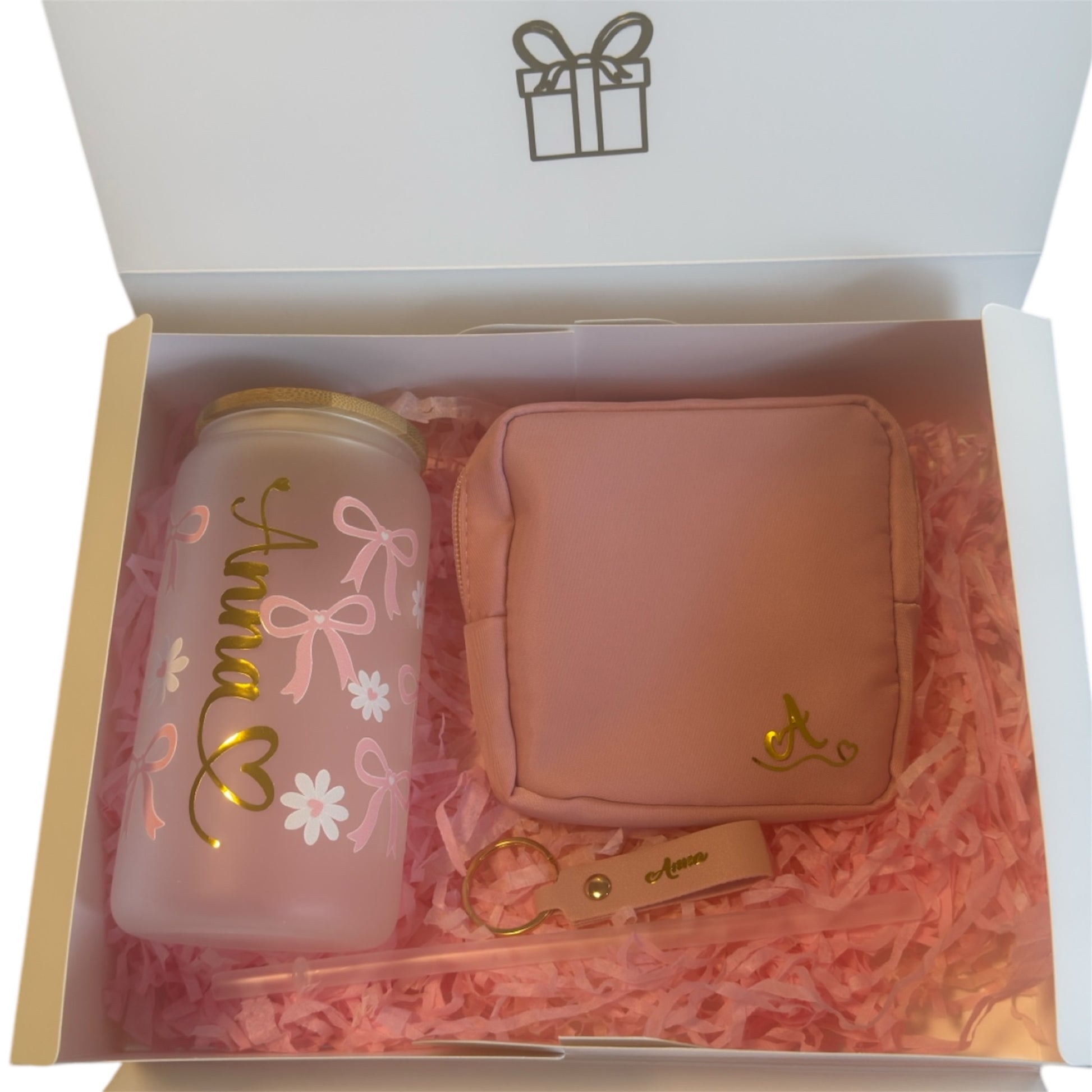 Gift Box: Designer Glass Tumbler, Toiletry Bag, and Name Keychain