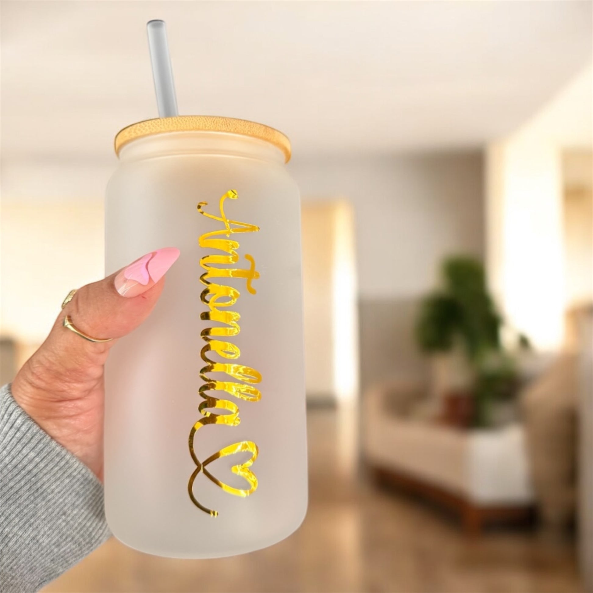1 Personalized Glass Tumbler with Straw and Bamboo Lid: 16 oz